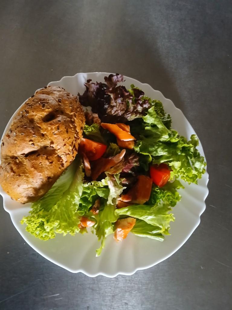 zeleninový salát s uzeným lososem, pečivo 1